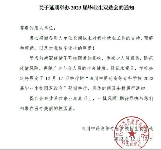 四川中醫(yī)藥高等??茖W(xué)校關(guān)于延期舉辦2023屆畢業(yè)生雙選會(huì)的通知